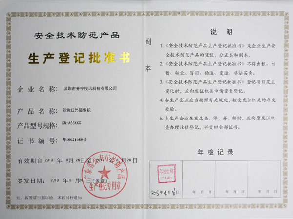 产品名称: 生产登记批准书 |