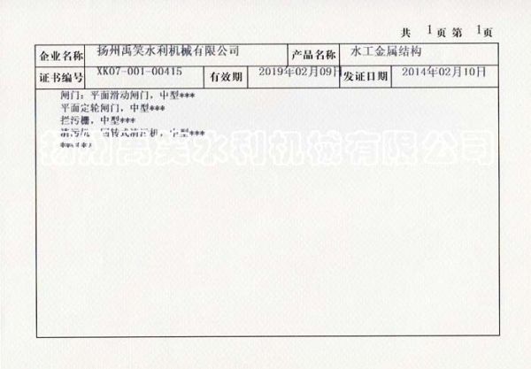 持证单位: 扬州禹笑水利机械有限公司