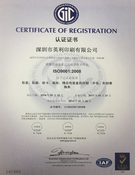 英利印刷ISO9001:2008英文版证书