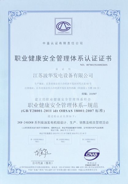 职业健康安全管理体系认证证书-中文